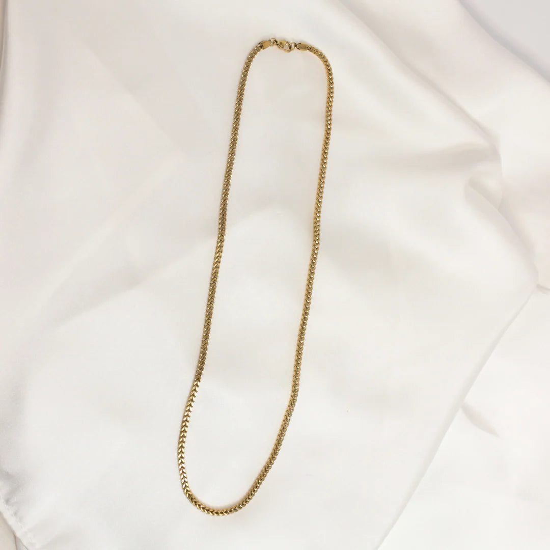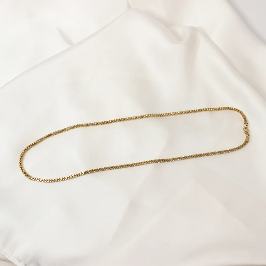 A sleek, square-shaped chain with fine, delicate links and a refined matte gold finish.